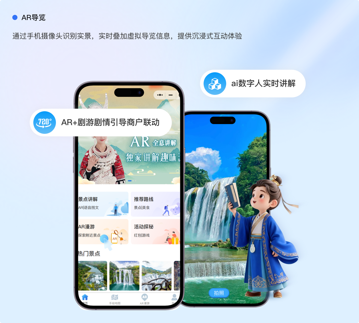 AR导览通过手机摄像头识别实景,叠加虚拟导览信息,实现虚实融合的实时交互式游览体验