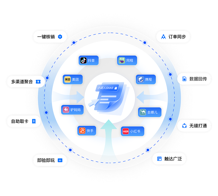 小泥人滑雪一卡通系统深度对接美团、抖音、快手、小泥人分销市场等主流OTA平台,系统自动同步订单、统一核销验证