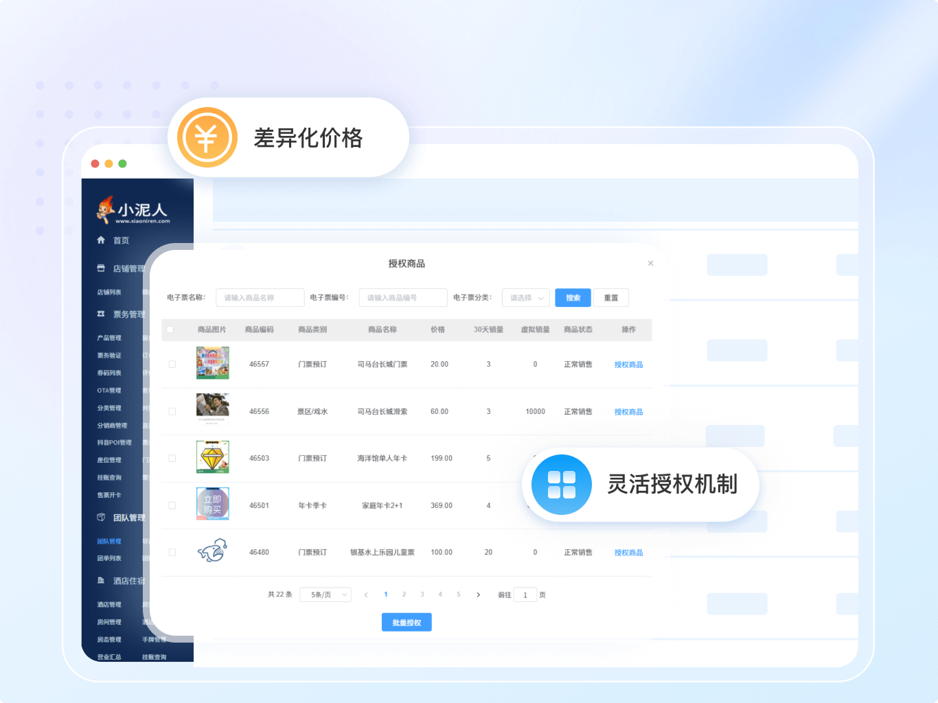 - 团票管理灵活高效团队门票产品授权操作简单,团队票务打印灵活支持团票和个票。门票按售价显示,按优惠价结算,团队分佣安全可靠。