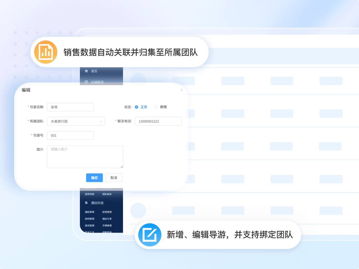 精细化管控导游资源,支持为团队分配、编辑及解绑导游,销售数据自动关联并归集至所属团队。