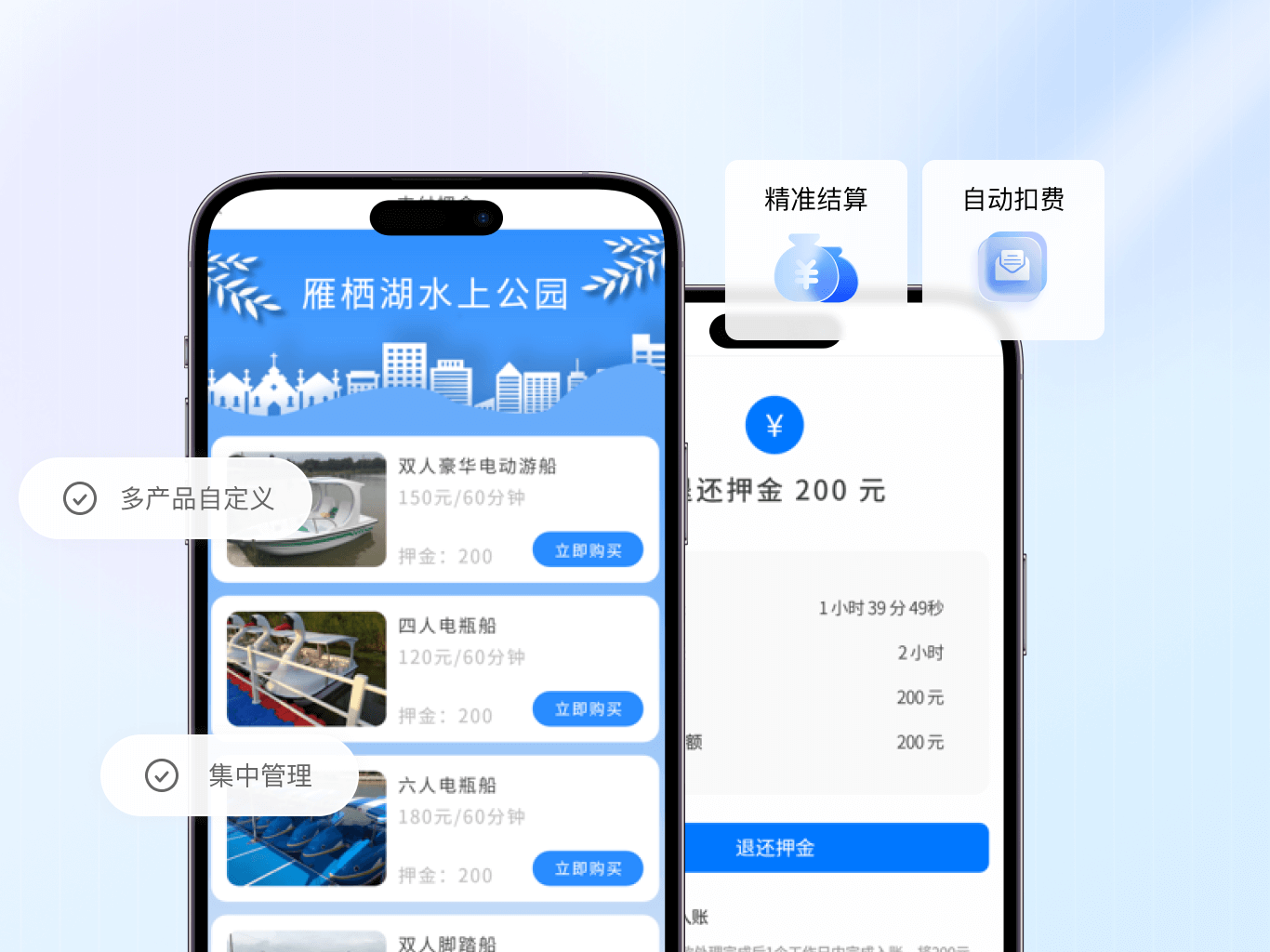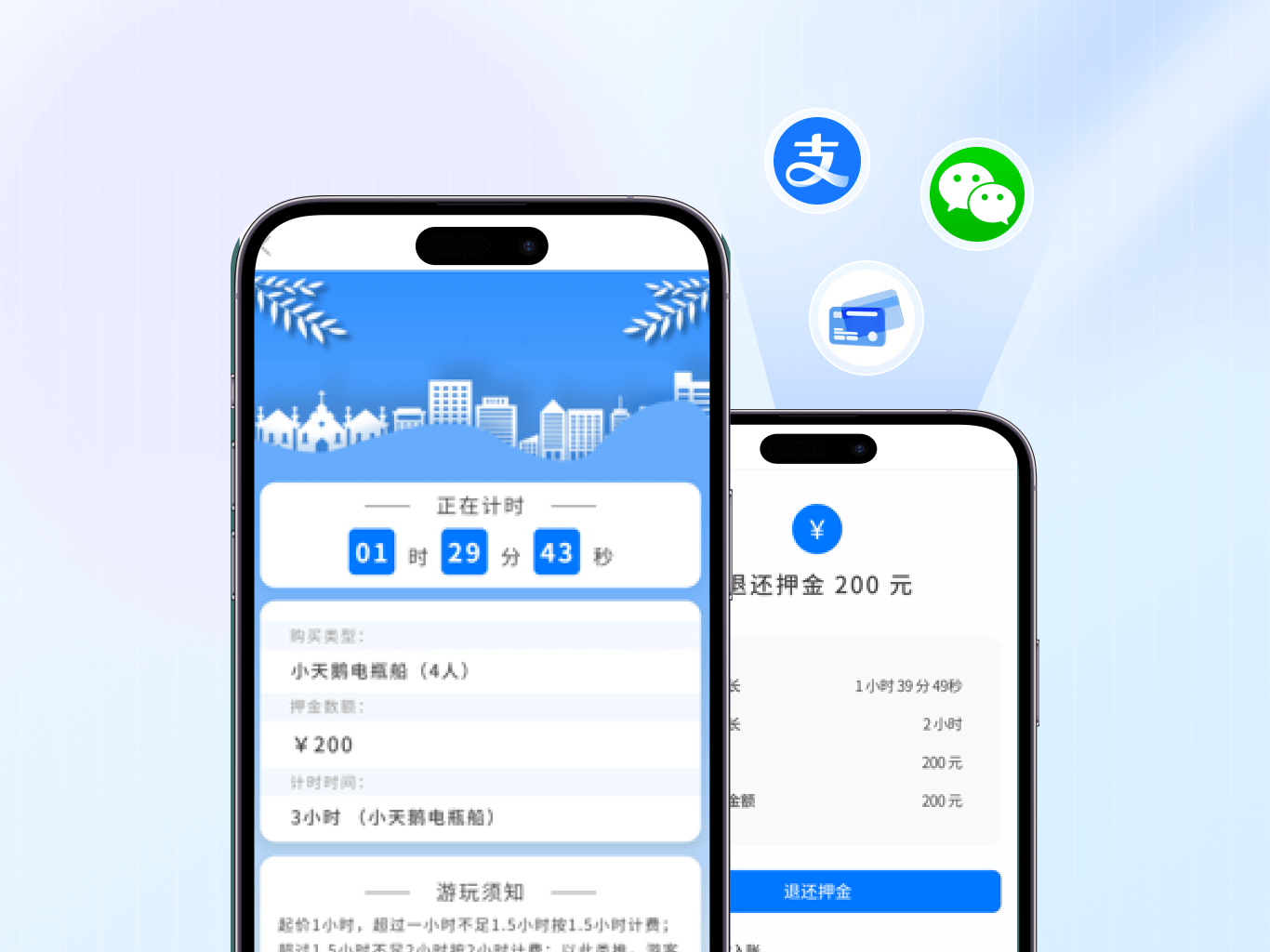 为游船、设备租赁等需要收押金计时收费场景而打造的软硬件综合解决方案。