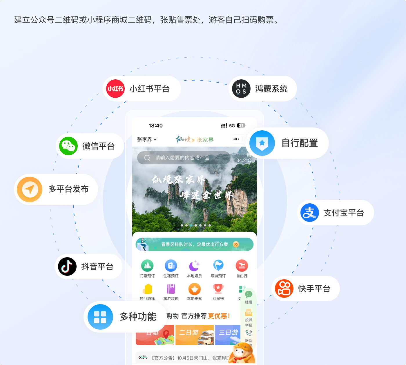 - 售检票系统:人工窗口售票、公众号售票、自助机售票、OTA分销、小程序购票