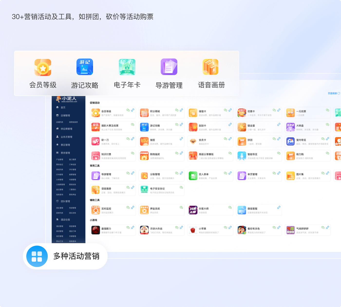 - 门票/会员介质:二维码、纸质门票、人脸、身份证、IC卡、手环