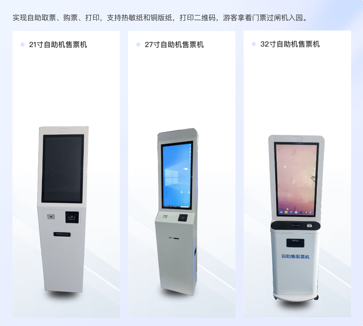 - 售票系统提供售票电脑、收银白盒子、热敏纸打印机、铜版纸打印机、身份证阅读器、IC卡阅读器,另有铜版纸门票设计及印刷服务