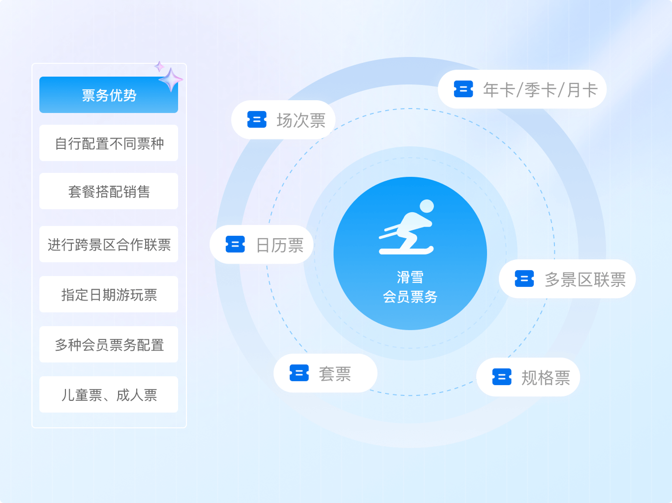 单日票、多日票、季卡、年卡、储值卡等;提前预约日场、夜场,确保雪场的客容量,避免拥挤。