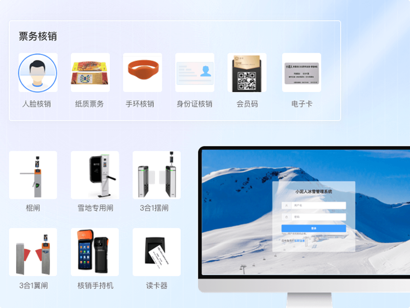 为中大型滑雪场及冰雪企业提供冰雪一卡通、装备租赁、滑雪教学、0TA对接等滑雪场管理系统及IC卡制作、自助取卡机、滑雪专用闸机等硬件信息化建设方案。